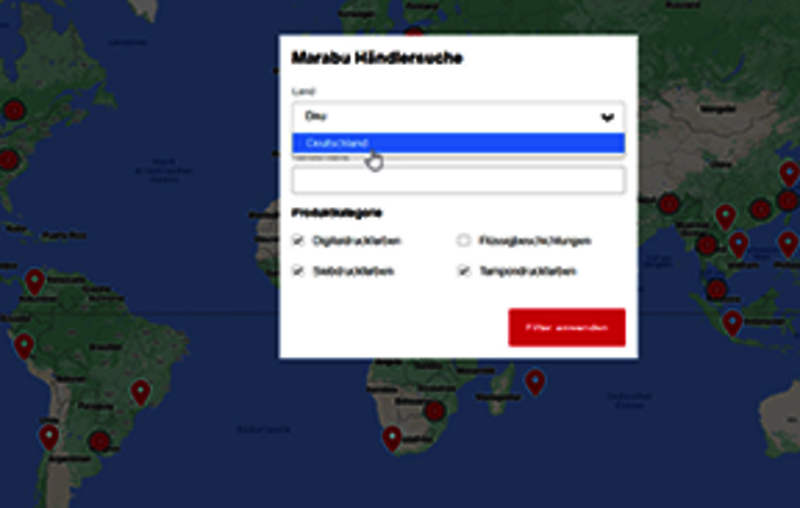 Wir freuen uns, Ihnen ab sofort bei der Suche nach dem passenden Vertriebspartner mehr kompfort bieten zu können. Die neu gestaltete Marabu Händlersuche lässt sich intuitiv bedienen. Sie können nach Land oder Postleitzahl filtern. Wenn Sie Ihren Händler bereits kennen, Ihnen allerdings die Telefonnummer oder Adresse fehlt, können Sie auch direkt nach der Firmierung Ihres Ansprechpartners suchen. Wir freuen uns zusammen mit unseren weltweit ansässigen Vertriebspartnern, dass Sie uns zukünftig schnell und einfach kontaktieren können, Sie den richtigen Ansprechpartner finden und einen guten Service rund um unsere Produkte und Dienstleistungen erhalten.